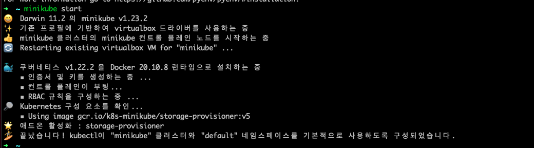 $ minikube start --disk-size='50000mb' 😄 Darwin 12.2 의 minikube v1.25.1 ✨ 유저 환경 설정 정보에 기반하여 virtualbox 드라이버를 사용하는 중 👍 minikube 클러스터의 minikube 컨트롤 플레인 노드를 시작하는 중 🔥 virtualbox VM (CPUs=2, Memory=4000MB, Disk=50000MB) 를 생성하는 중 .../그러나 실패