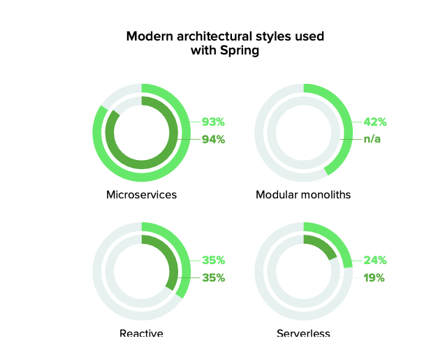 The shift to modern architectural styles continues 어두운 녹색이 2021년 그리고 밝은 녹색 2022년을 의미한다. 작년 대비 크게 변화는 없지만 마이크로서비스에 90% 이상 활용하고 있다. 한편 Serverless의 경우에는 약 5%정도 늘어나게 되었는데 Spring Boot 3 활용을 통해 내년에는 비율이 더 많이 늘어날 것이란 생각이 들었다. 이유는 Spring Native 때문인데 Serverless와 매우 밀접한 관계가 있기 때문이다.