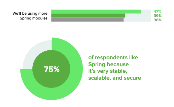 Almost half of stakeholders (47%) reported that they will be using more Spring modules in the coming years, an increase of 8 points. For 2022, the top three Spring Projects remain Spring Security, Spring Data, and Spring WebMVC
